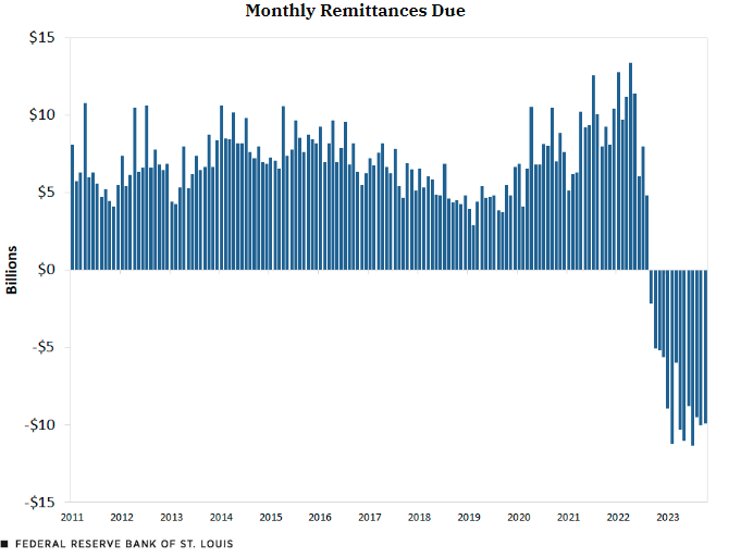 随着美联储提高利率,为了补偿各大商业银行放在美联储的准备金,美联储需要支付更多的利息,加上日常逆回购操作的利息支付,这些支出数字超过了美联储从债券和服务中获得的回报,使美联储陷入亏损。随着联邦基金利率区间(目前在5.25%-5.5%之间)的不断升高,而美联储拥有并产生收入的债券存量减少,亏损进一步增加。