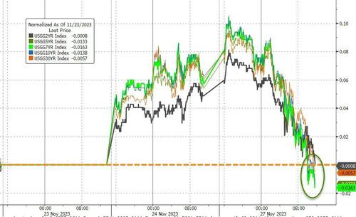 财联社11月28日讯(编辑 潇湘)美国国债收益率周一(11月27日)普遍走低,基准10年期美债收益率在美国月度成屋销售数据降幅大于预期后,延续了本月早些时候的跌势。目前,市场人士对美联储明年降息的预期正进一步升温,除非美联储官员在噤声期前的讲话格外鹰派,抑或本周出炉的一系列重磅数据超预期火热,否则当前利率市场的整体趋势或许很难轻易改变。