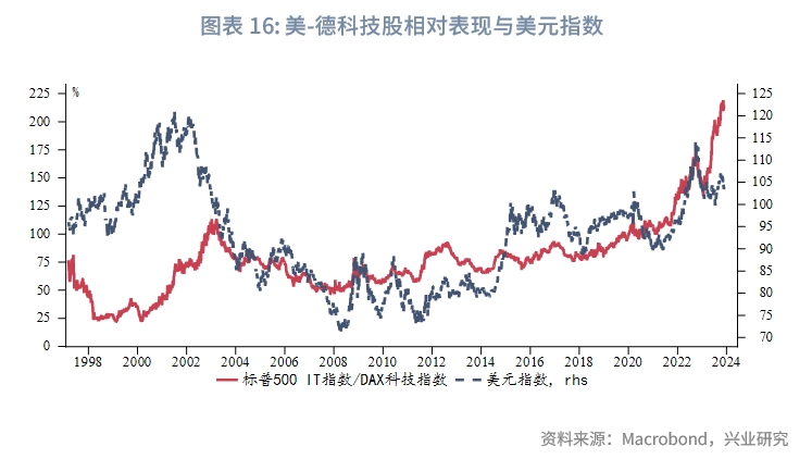 按照传统的金融市场逻辑,当美国政策利率水平相对更高、经济增长相对更快时,美元往往升值。将此逻辑套用在“科技美元”,则是当美国科技相对优势更强时,美元应趋于升值。美元指数定价主要考虑发达经济体货币,因此美国相对发达经济体,尤其是相对欧盟、日本、英国的相对科技优势应对美元指数会产生中长期影响。