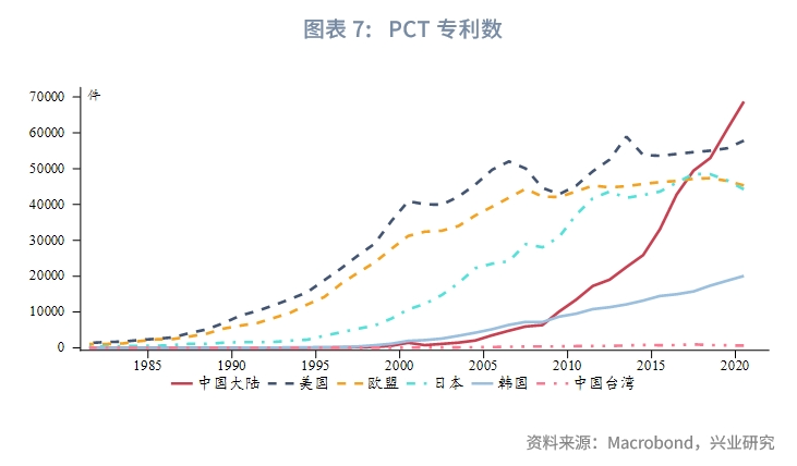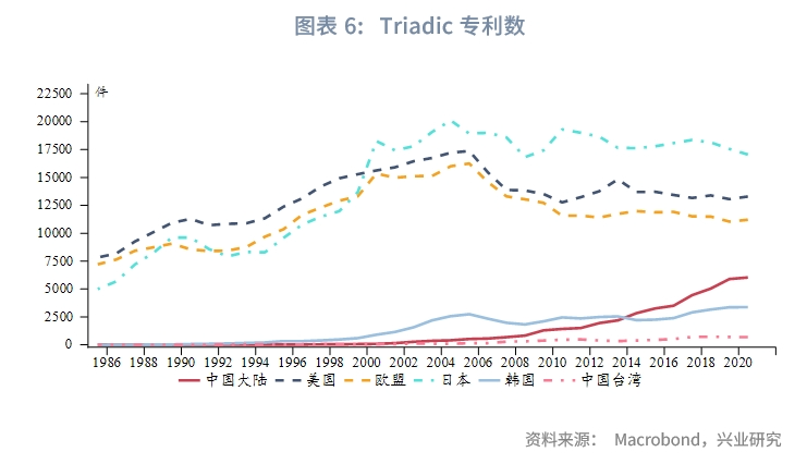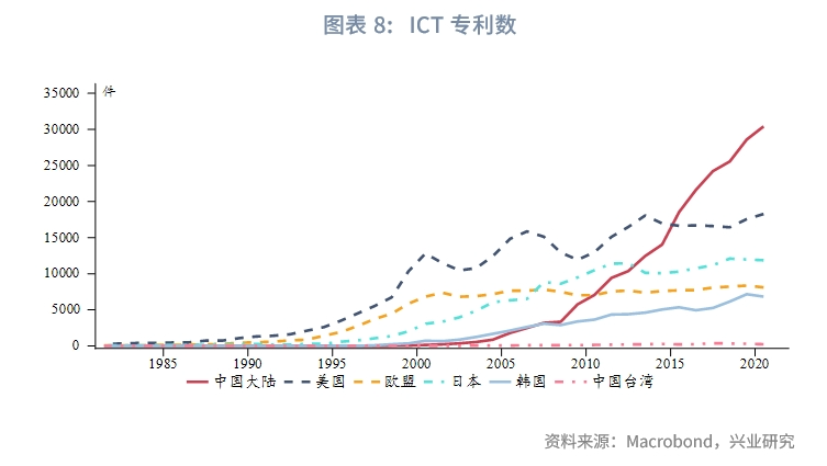 如果以专利数量衡量科研成果,美国和“芯片四方联盟”的优势依然显著,但中国大陆正在奋起直追。OECD主要统计了Triadic、PCT(Patent Cooporation Treaty)、ICT(Information and Communications Technology)三类专利。