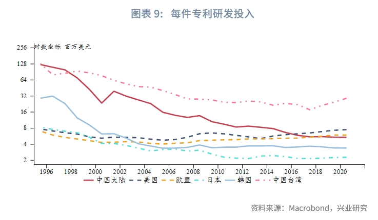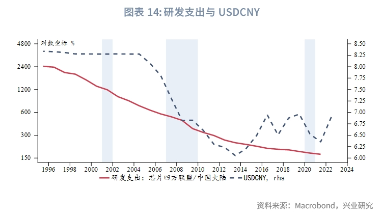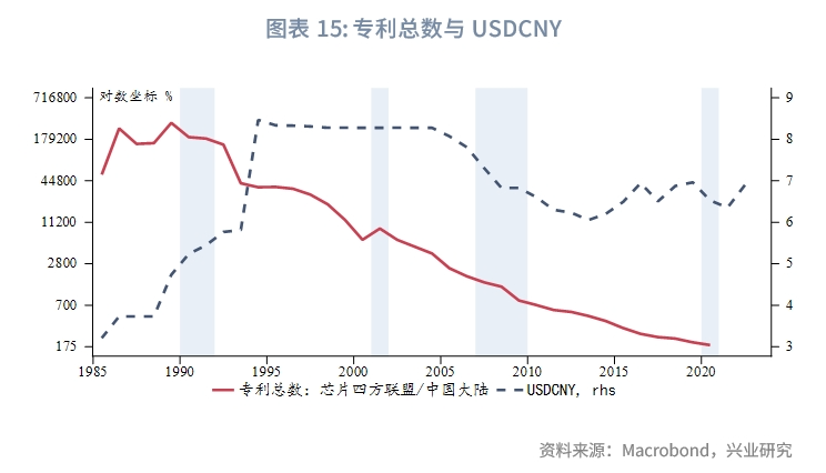 不过,随着近年来中国大陆加大研发投入并迅速实现科研转化,无论是以研发投入还是以专利成果衡量,“芯片四方联盟”的相对优势已经显著缩小。如果将科技相对实力作为汇率的定价参考,人民币相对美元汇率呈现一定程度的低估。