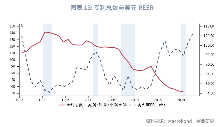造成这一现象的主要原因是中国大陆研发投入激增;同时,美元兑人民币汇率在“811”汇改后依然以美元指数为主要定价参考,底层定价逻辑仍是更多反映美国与发达经济体的基本面差异,未能充分反映中国科技进步的市场影响。从专利总数的角度也是类似的情况,加入中国大陆专利数后美国的科技优势明显减弱,美元REER显得高估。
