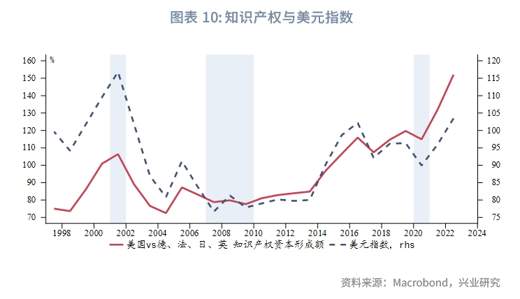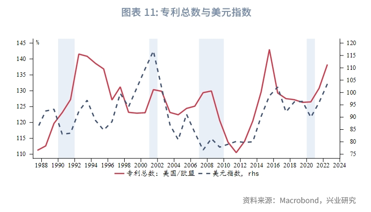 从知识产权资本形成额和专利总数(包含Triadic、PCT、ICT三类专利)两个角度考察,我们发现美国的科技相对优势与美元指数中长期走势具有较高的正相关性。次贷危机后美国保持了较高的科技研发强度和科研转化能力,这使得美元指数中枢较次贷危机后的低谷明显抬升。