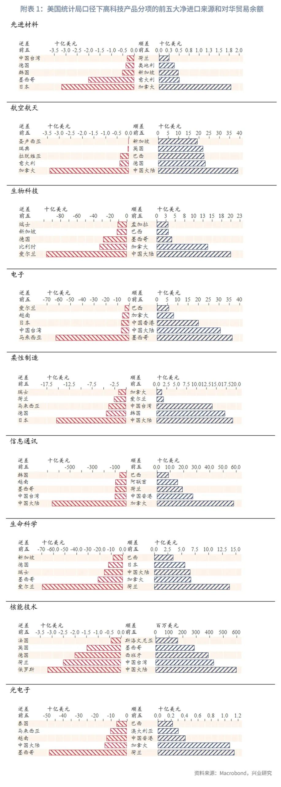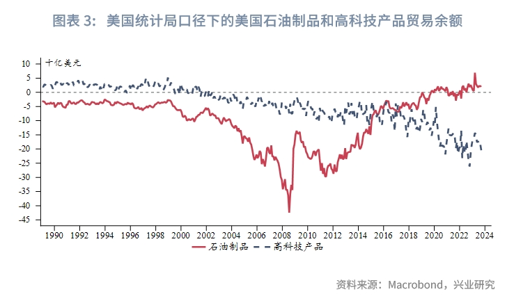 (3)在高科技产品贸易中,美国依然是贸易逆差国,更多是通过专利、出口管制、跨国公司等方式把控全球产业链,生产环节并未高度本土化。美国的高科技产品贸易逆差规模与石油贸易逆差规模接近,不会颠覆当前美元环流机制。