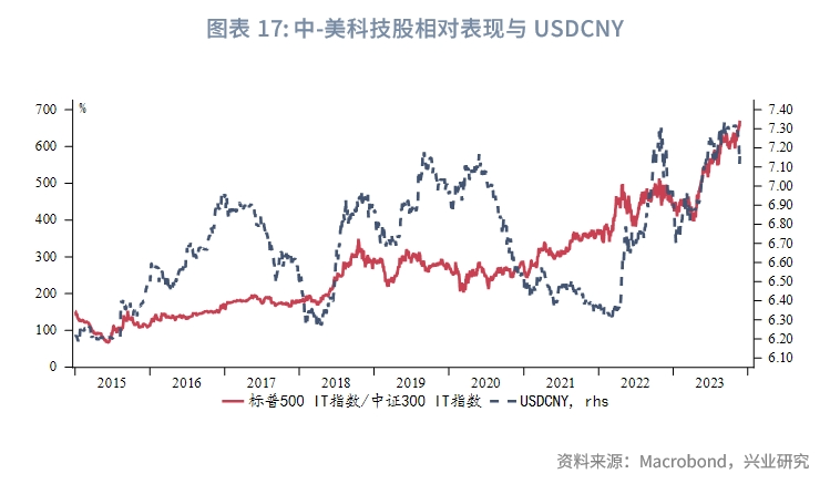 美国科技股相对中国科技股的表现和美元兑人民币汇率在2015年“811”汇改后也有一定正相关性,且在2020年后这种相关性有所强化。即美元兑人民币汇率未来可能不再仅以美元指数为定价基准,开始更多地将中国因素,尤其是将中国的科技实力增长纳入考量。