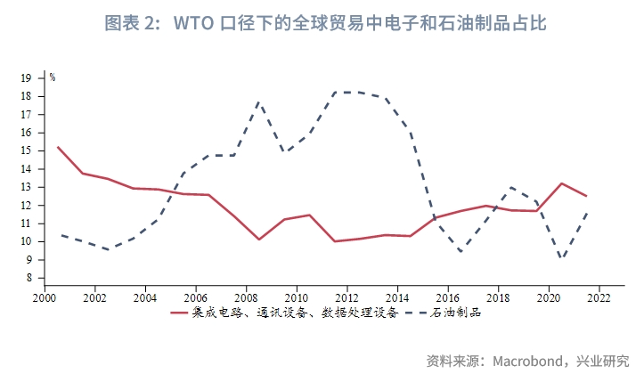 (1)高科技产品需求具有刚性。芯片、通讯设备等电子产品是一国发展科技、现代化建设的必须品,战略意义不亚于石油。近年来在全球贸易中的份额甚至已经超过石油制品。