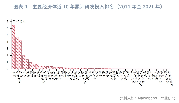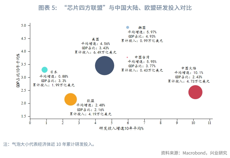 此外,“芯片四方联盟”中的日本、韩国、中国台湾地区研发投入均名列前茅。考虑到美国对于日本、韩国、中国台湾地区的政治影响力和密切的高科技产业关联度,如果将“芯片四方联盟”作为整体看待,对中国大陆、欧盟优势进一步扩大。中国大陆作为后起之秀,近10年研发投入增速显著高于其他经济体,但研发支出在GDP中占比仍有较大上升空间。