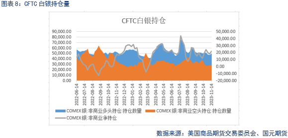 截止11月14日,黄金非商业多头持仓为254352张,较上周减少7301张,非商业空头持仓为98976张,较上周增加3539张,基金净持仓减少10840张,多头离场,空头进场;截止11月14日的周度统计周期中,白银非商业多头持仓为50291张,较上周增加3095张,非商业空头持仓为27893张,较上周减少1050张,基金净持仓增加4145张,多头进场,空头离场。