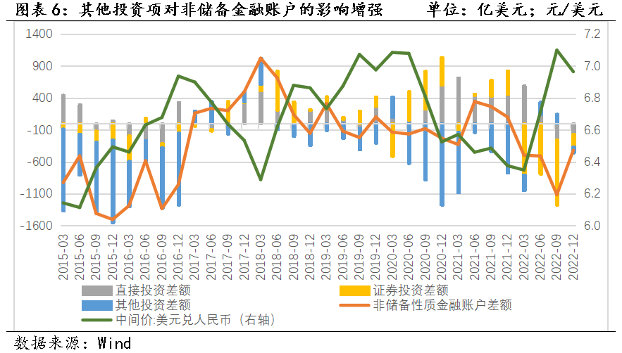 一般情况下,其他投资与贸易和直接投资的收支情况互补,但其他投资的波动性较大,其差额变动与人民币升贬值走势不完全一致,对人民币汇率的影响既有顺周期性也有调节性(图表5)。其他投资项在2020年以来成为非储备金融账户中波动最大的一项(图表6),是因为其他投资项下的市场主体来自于商业银行及其他金融机构。这些机构的资金行为或带有市场调节性或带有投机性目的,受多方面因素的影响,波动方向和规模有较大不确定性。