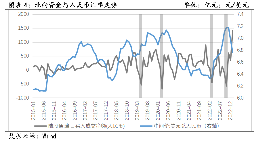 在股票投资方面,跨境资金流动是通过陆股通(即北向资金)实现的,主要受市场风险偏好的影响,对人民币汇率的阶段性影响明显。2015年以来,北向资金出现4次单月净流出规模超400亿元,基本都是来自风险事件的影响,并直接触发了人民币汇率的波动(图表4)。2019年5月,中美贸易战升级导致人民币汇率承压,跌幅约3.0%;2020年3月,全球疫情大范围蔓延,美股市场风险指数急剧上行,北向资金净流出679亿元,是2014年以来的历史最低点,当月人民币汇率贬值约2.6%;2022年3月,在俄乌冲突和疫情封控的双重影响下,北向资金连续数日大规模净流出,人民币结束升值周期,4月急贬约4.2%;2022年10月,在美联储激进加息、国内经济修复不及预期和房地产风险增大的影响下,北向资金再度大幅流出573亿元,当月美元兑人民币汇率突破1:7.25。