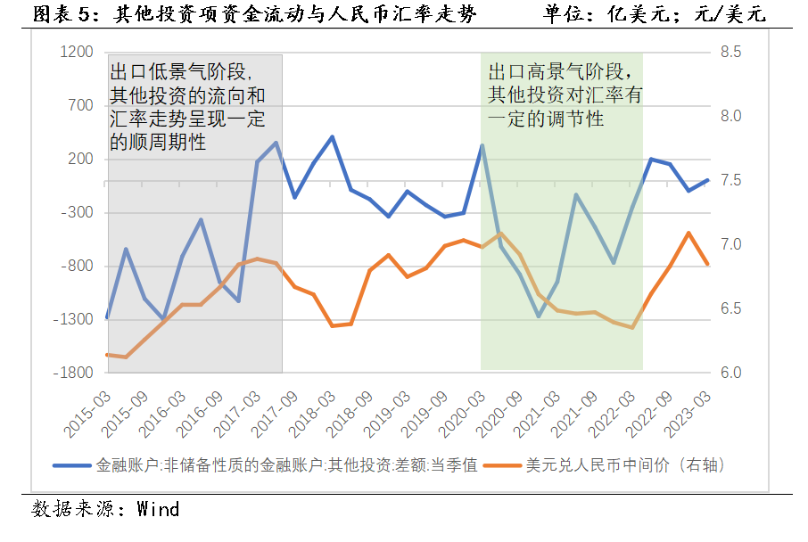 其他投资项的资产和负债端的变动主要受到“货币存款”、“贷款”、“贸易信贷”三个子项的影响。2015-2016年期间我国出口增速明显放缓,经常账户顺差的降低意味着负债端“货币存款”和“贸易信贷”减少,即跨境资金净流入的降低。“一带一路”战略推动下对外直接投资增加,带动了资产端“贷款”的增加。最终其他投资项下跨境资金净流出与人民币汇率贬值同步呈现。但在2020-2021年期间,我国出口保持高景气,不仅提升了对“贸易信贷”的融资需求,也促进“藏汇于民”和金融机构外汇存款余额的增长,带动了资产端“货币存款”和“贷款”的扩张,即跨境资金流出的增加。此时,其他投资的资金流出只是持汇金融机构的市场调节行为,并未影响因强势出口和证券投资资金流入带来的人民币升值趋势。