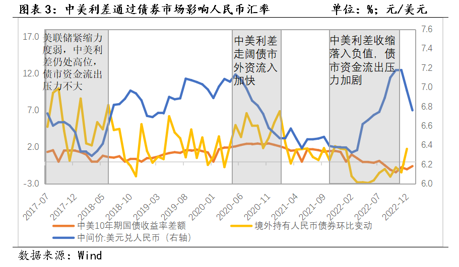 证券投资和其他投资体现的是短期跨境资本流向,可解释多数情况下人民币汇率的短期波动。在债券投资方面,中外利差走阔(或收缩)影响资本流动,推动人民币汇率升贬值(图表3)。其中体现最为明显的是两个时期。一是2020年2-4季度,美国天量的货币宽松带动其10年期国债收益率不断下行,中美10年期国债收益率之差由1.3%走阔至2.5%,债券投资项下资本大量净流入约1519亿美元,同比增速高达70.2%,人民币汇率在此期间升值约8%。二是2022年1-3季度,随着美联储开启激进加息,中美10年期国债收益率之差急速收窄并倒挂,由1.4%降至-1.1%,外资机构的人民币债券持有量连续8个月减持,共计6648亿元,加之国内经济受疫情拖累,人民币汇率期间贬值约10.6%。