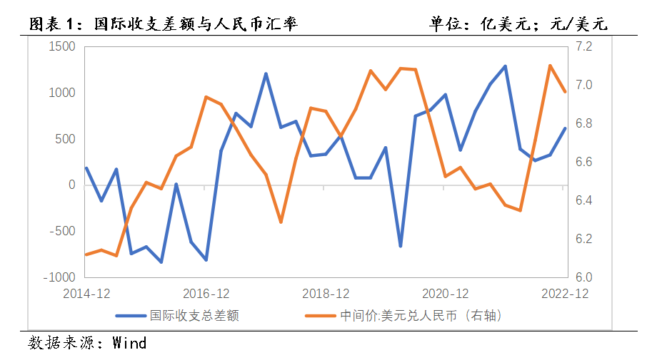 国际收支对汇率具有重要影响。当国际收支顺差扩大,市场外汇供大于求时,对人民币的需求就会上升,人民币具有升值压力;反之国际收支逆差,外汇供小于求,对人民币的需求可能走弱,人民币面临贬值压力。从2015年以来国际收支与人民币汇率的走势中,可以看到美元兑人民币汇率中间价和我国国际收支顺差呈较为明显的负相关性(图表1)。