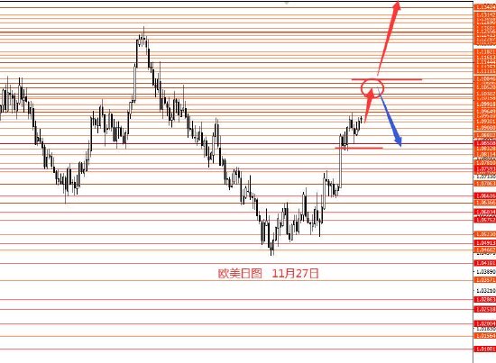 11月27日,美指上周区间震荡,周图收小阴柱。从图形来看,前期思路大框架延用即可,本周104.00以下继续看空,短线关注上周下方红圈转折点102.80和102.40区域,本周暂时只能看到这里,若下个月继续阴跌下行,则延用上周一红线节奏行情,反则得以支撑再关注备选蓝线行情。本周操作建议:103.50/103.70区域做空,止损104.20,目标看向102.80和102.40,若能成功跌破102.20再看向更低。控制仓量,严格止损。