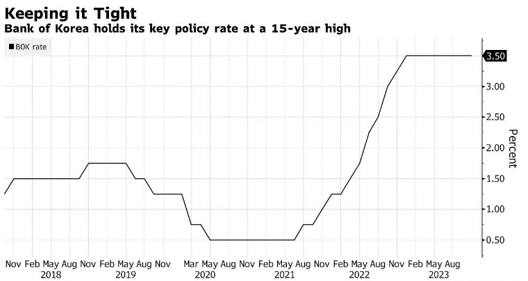 在韩国央行决定保持不变之前,韩国10月份通胀意外加速,家庭债务在夏季达到创纪录水平,这加强了货币政策委员会在更长时间内保持利率限制的理由。在全球半导体需求反弹的支撑下,出口开始复苏,这让当局相信,即使一些海外经济体的整体经济活动放缓,他们仍有能力将出口保持在15年高位。