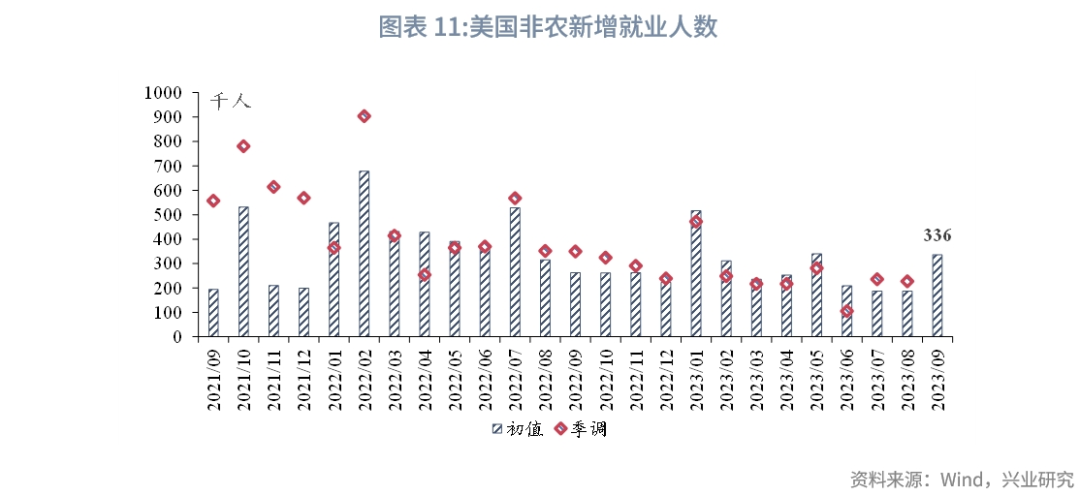 10月6日,美国劳工统计局公布的数据显示,美国9月非农就业人口增加33.6万人,远超预期的17万人。细分行业来看,许多领域都表现强劲。休闲和酒店业领涨,增加了9.6万个新的就业岗位。政府类工作增加了7.3万,医疗保健领域增加了4.1万,专业、科学和技术服务类增加了2.9万。此前两个月的就业数据也被大幅上修:8月的新增人数上修4万人至22.7万人,7月的数据从15.7万人上调到23.6万人。此外,美国9月失业率为3.8%,高于预期的3.7%,与前值持平;平均时薪环比增长0.2%,低于预期的0.3%,前值为0.2%;平均薪资同比增长4.2%,低于预期的4.3%,前值为4.3%;劳动力参与率稳定在62.8%,与预期和8月数据相同。
