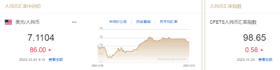 12月1日,人民币中间价报7.1104,下调86点,上一交易日中间价报7.1018。