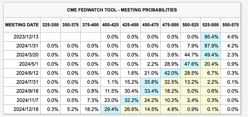 PCE通胀指标和申请失业救济人数均释放有利于美联储结束加息、明年上半年开始降息的信号。芝商所的“美联储观察”工具显示,市场现在认为美联储在12月进一步加息的概率不足5%,预计美联储将在明年5月左右开始降息。