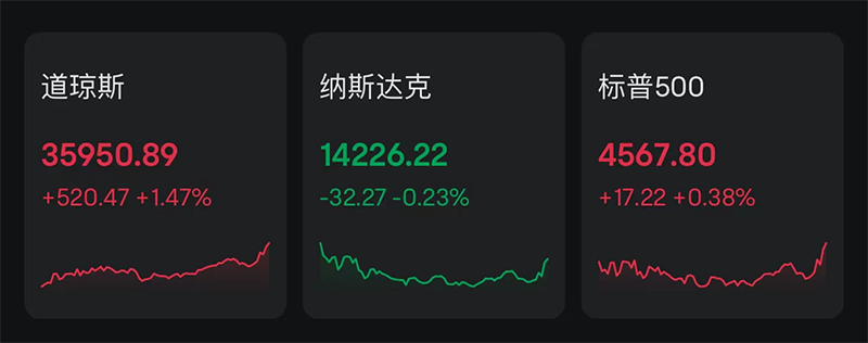 11月收官日,美股三大指数走势分化。截至收盘,道指涨520.47点,涨幅1.47%,报35950.89点;标普500指数上涨17.22点,涨幅0.38%,报4567.80点;纳指下跌32.27点,跌幅0.23%,报14226.22点。