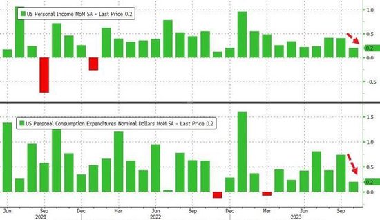 10月份个人收入和支出均环比增长0.2%,增速双双放缓。与此同时,个人收入同比增长4.5%,为2022年12月以来的最低水平;支出同比增长5.3%,为 2021 年2月以来的最低水平。