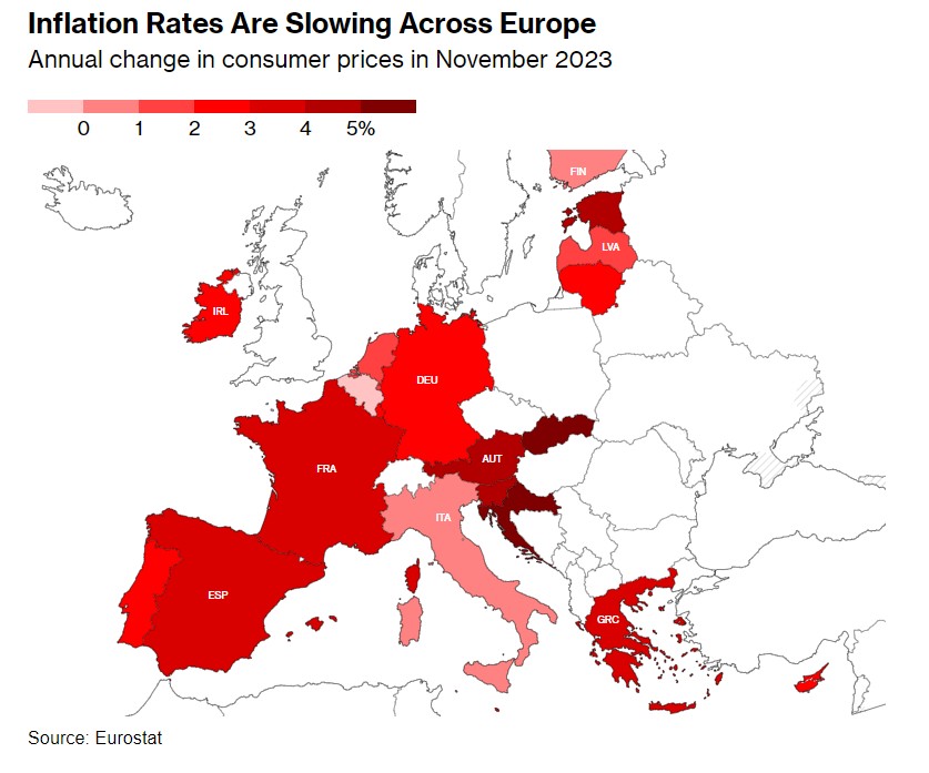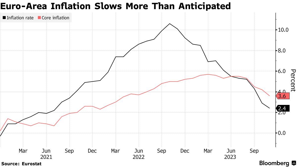 数据显示,欧元区11月份消费者价格指数(CPI)同比增长2.4%,远远低于上个月的 2.9%,也低于彭博社调查中所有经济学家的预期,同时远远低于去年超过10%的峰值。欧元区11月几乎所有类别的价格压力持续缓解,并保持在两年来的最低点附近。不包括燃料和食品等波动性成分的欧元区核心通胀指标(11月核心CPI)连续四个月放缓至 3.6%。