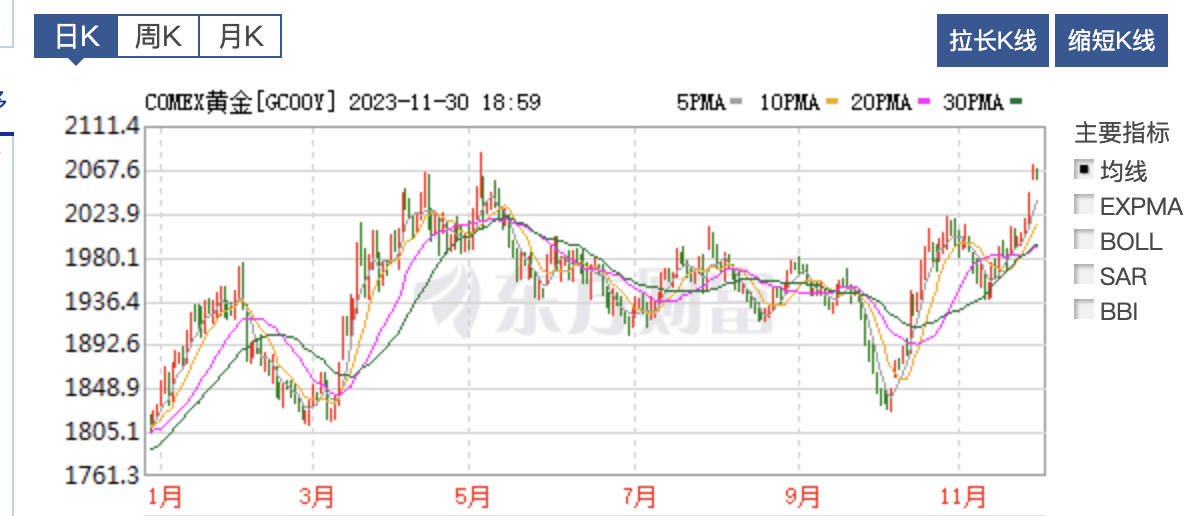 11月29日,COMEX黄金期货盘中一度涨破2072美元/盎司,逼近年内最高点2085美元/盎司,30日,虽小有回落,但仍处高位运行。截至发稿前,COMEX黄金期货达2062.6美元/盎司,年内累计上涨11.77%。