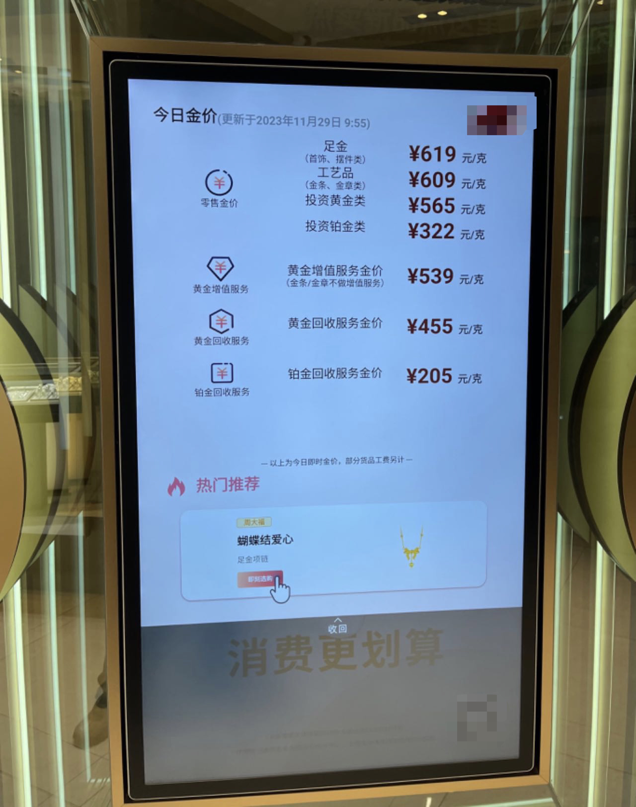 尽管对近期的金价有所准备,但好几年没买首饰的周凯,还是吃惊于店内高昂的金价,“贵太多了”。时代财经了解到,当天店内展示的饰品金价已达619元/克,而据金投网数据显示,在国庆假期期间,该品牌的首饰品金价最低才583元/克。一月多时间,首饰黄金每克价格上涨了近6.2%。