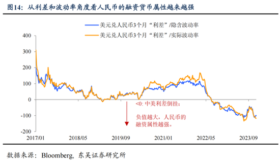 今年人民币的融资货币特征愈发明显。我们通常使用“利差/波动性”指标来衡量一个货币是否适合作为套息交易中的融资货币——一般相对于其他货币的利差越大、波动越小越好。如图14所示,这一指标负值越大,人民币的融资货币的特征会更凸显。