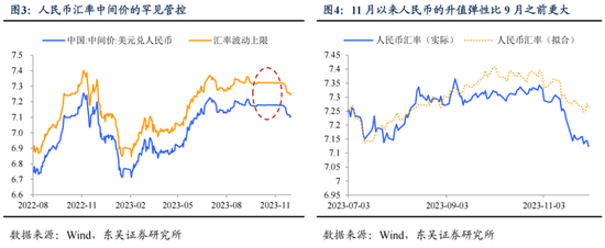 要理解为什么我们认为本轮人民币升值幅度偏大,就要从第一个变化——“政策底”的属性上升。集中体现在守住汇率底线的决心更加坚定了,如图3,今年9月中旬至11月中旬,人民银行将中间价固定在7.18左右,帮助人民币汇率守住7.32的底线,而期间美元一度涨破107、创下年内新高,而这一汇率调节方式在2015年8月汇改之后已经极少出现。