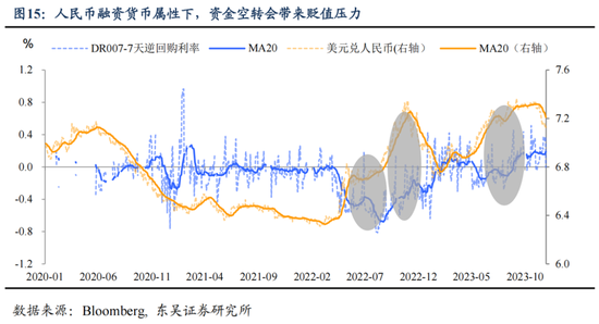 今年货币政策的两大变化与此有关。一是更加“吝惜”降息,今年经济压力最大的第三季度也仅降息15bp(MLF利率),导致今年实际利率反而是上涨的;二是对于“资金空转”更加警惕,如图15,资金空转和利率波动的下降(我们用DR007和逆回购利率之差来衡量)会放大人民币的贬值压力,今年8月之后央行等监管机构对于这一现象的治理力度明显增强,集中体现在尽管流动性没少放但货币市场却持续偏紧,我们预计这些情况在2024年仍会持续,只是在外部压力下降的情况下,程度上会有所缓解。