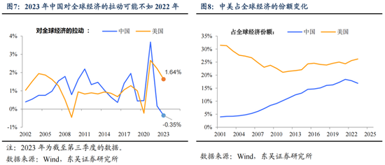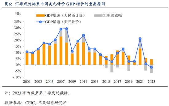 人民币汇率的“政策底”:从中美增长竞争的视角。今年可能会是自2001年中国加入WTO以来第一次出现以美元计价的GDP增速录得负值的年份——从前三季度看,中国美元计价GDP增速约为-2%,其中汇率贬值幅度超过6%。这导致的直接结果是2023年中国对全球经济的拉动不如美国、甚至不如2022年。