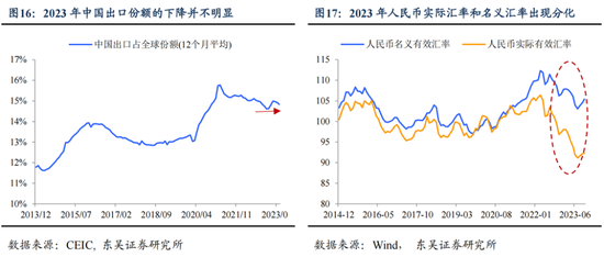 在汇率和利率都受到掣肘的情况下,为了稳增长,出现了第三个重要变化:经济“反哺”汇率,加剧了内部通胀的疲软。2023年中国出口相较全球而言并不差,截至今年7月出口份额相较去年年底仅下降0.3个百分点,在内需疲软的情况下,对稳增长作出了重要贡献。这背后除了出口的结构性调整外,中国的实际有效汇率下降至近10年的低点也是重要原因。