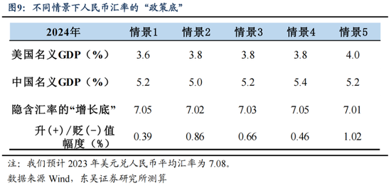 因此,从这个维度我们可以得到人民币汇率“政策底”的两个标准。低标准可能是保证美元计价的GDP增速高于0,而高标准可能是使得中国对于全球经济的拉动不低于美国。按低标准计算,2024年美元兑人民币平均贬值幅度不应高于名义GDP增速,我们预计2024年中国名义GDP增速可能为5.2%,对应人民币汇率的贬值底线为7.45。而按高标准计算,根据IMF预测2024年美国名义GDP增速约为3.8%,对应中国经济增速应为5.9%,这需要2024年人民币额外升值0.7%,对应人民币汇率的底线是7.03。