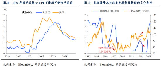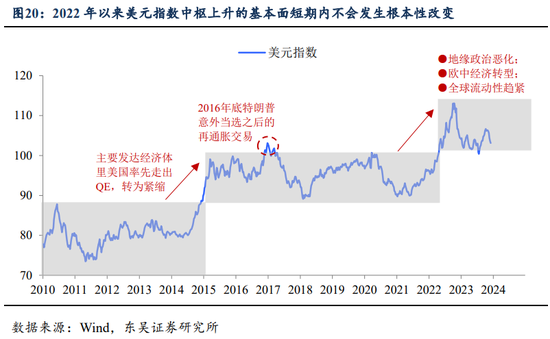 因此,我们在基准情形下并不预期2024年美元中枢会跌破100,相反市场对于美元向上风险的预期是不足的。