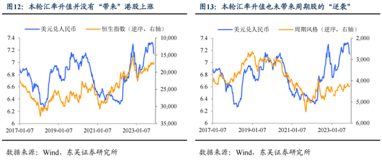 而正因为本轮汇率的“大幅”升值背后有更多市场微观结构层面和季节性的因素,其对于股市的指示作用也弱化了。一般而言,汇率的大幅升值至少会带来H股和周期、价值风格类股票的明显上涨。但是如图12、13所示,这一次不太一样。