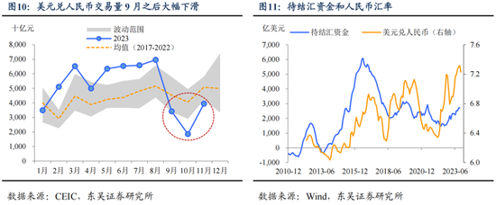 “政策底”的另一个后果是人民币汇率的“顺周期”市场信号意义下降。从汇率自身来讲,政策干预最大的影响是交易量的大幅下降,9月中旬开始坚守7.32底线后,9、10、11月美元兑人民币交易量均跌至有数据以来的同期最低,市场深度显著下降。因此在美元见顶回落、不断累计的待结汇资金临近年末“蓄势待发”的催化下,人民币短期内升值的速度很快,我们也预计未来一、两个月,人民币汇率会呈现“更容易升值”的特性。