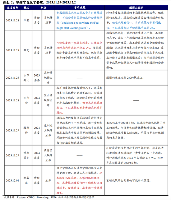 常任票委意外放鸽,市场降息预期上冲。11月28日,联储常任票委沃勒在参与活动时表示,“若通胀在未来3-5个月继续缓解,可能会看到开始降息的时点”,引发市场降息预期大幅提高。尽管同日发言的联储官员鲍曼和古尔斯比对通胀和货币政策的看法都偏向于谨慎,但未能阻止市场对降息预期的强化。