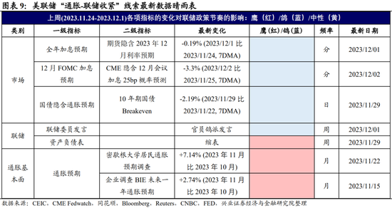 实际上,在本轮加息周期的后半程,市场对于联储货币政策转向宽松的预期持续“抢跑”联储官员点阵图的指引;但是,在联储的鹰派管理和美国经济韧性的支撑下,市场的预期也逐步向联储鹰派靠拢,市场预期2023年12月政策利率在5.25%及以上的概率自6月以来不断上修。展望看,劳动力供给改善依然偏慢、能源对通胀的拖累或将减弱,美国通胀回落进入深水区,联储货币政策的决策可能依然偏向谨慎(详参2024年报《瓶颈期下的再平衡》)。那么对于市场来说,在联储释放明确的降息信号之前,经济数据若与预期产生背离,或仍将对资产价格造成扰动。12月FOMC会议前,仍需关注12月8日非农就业、12月12日CPI数据对联储政策决策的可能影响以及对市场的扰动。