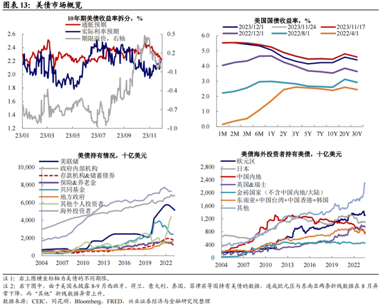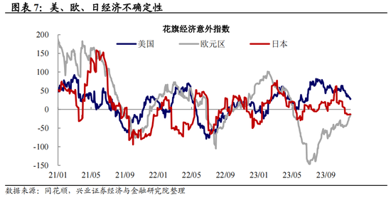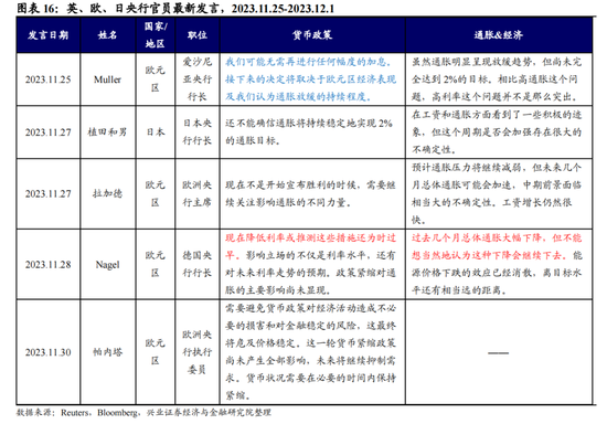 欧元区:欧元区通胀继续回落,11月调和CPI同比初值较前值下降0.5个百分点至2.4%,食品、能源、核心商品和服务分项同比增速均下降。市场降息预期加深,但欧央行行长拉加德等官员对货币政策措辞较谨慎。