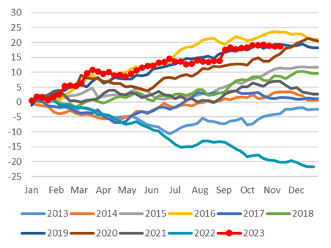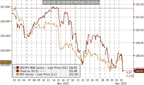 美国经济数据是否连续第二个月趋弱 美元指数在11月的下跌了约3%,基本回吐了9月以来的所有涨幅。我们认为美元转弱与弱于预期的10月美国经济数据有关。因为失业率的上行和通胀的下行都超市场预期,市场动摇了此前对于美联储将基准利率维持“更高更久”的预期。开始定价加息周期的结束,甚至定价美联储在2024年更早、更深幅度的降息。我们认为,转向交易能否在12月份延续,或将在很大程度上取决于美国经济数据的强弱。我们认为如果数据显示美国就业和通胀连续第二月趋软,那么美元指数或在年内仍有下行可能。