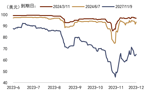 房地产迎来政策利好。11月房地产行业迎来多重利好,有关部门或愈加关注主要房企的流动性问题,后续有望压低风险溢价。政策方面,上海证券报报导称[2],证监会称将继续积极支持稳妥防范化解大型房企风险,做好房地产企业合理融资支持和融资监管。一视同仁满足不同所有制房地产企业合理融资需求。坚持“一司一策”化解大型房企债券违约风险。在上述精神指导下,农业银行[3]、工商银行[4]、建设银行[5]等主要银行均与房企召开座谈会,参与企业甚至包含碧桂园等已出险房企[6]。企业方面,随着十月中旬起万科美元债价格出现异常波动,月初深圳国资委即表态全力支持万科应对风险。此后万科美元债价格迅速恢复(图表9),并带动龙湖、金地等头部房企美元债价格也有所走高。11月亦有头部房企融创境外债重组成功[7],减轻了约900亿元人民币的债务风险。融创或成为首个完成境内外债务重组所有流程的大型房企[8]。