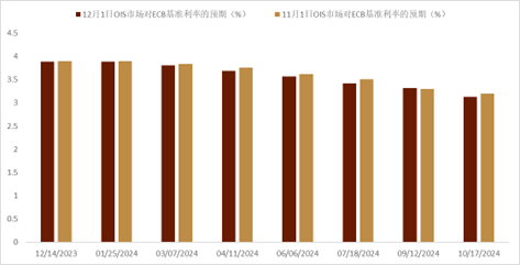 本次ECB有关未来经济增长和通胀的预测较为关键,ECB在9月会议上对经济增长前景进行全面下修:预计今年,明年和后年的GDP增速分别是0.7%,1.0%和1.5%,如果ECB在12月会议上再次做出下修,那么市场可能会解读为鸽派。而9月会上ECB预计今年,明年和后年的CPI增速分别是5.6%,3.2%和2.1%,核心CPI增速分别是5.1%,2.9%和2.1%;考虑到11月CPI已经降至2.4%(非常接近欧央行2%的通胀目标)。我们认为,ECB可能会下修对未来通胀的预测,如此一来市场可能会对明年的利率路径预期有所下调。