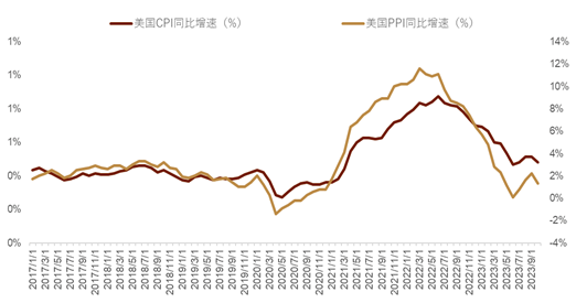 美国通胀继续放缓。10月美国CPI数据显示通胀压力继续放缓,CPI和PPI的同比增速均大幅低于前值(图表19)。而美联储青睐的PCE通胀指标显示,10月PCE指数同比上涨3%(低于前值的3.4%和市场预期的3.1%);剔除能源和食品后的核心PCE物价指数同比增长3.5%,同样低于前值的3.7%。不过,11月密歇根大学调查的未来一年消费者对通胀的预期意外创下最近七个月新高,较初值也出现了进一步的攀升:1年通胀预期终值录得4.5% vs预期4.4%,初值4.4%;而5年期通胀预期终值则录得3.2%,vs预期3.1%,初值3.2%。我们认为,如果11月的官方通胀数据继续有所回落,那么市场可能会更多的定价美联储明年降息的概率(市场目前预计明年上半年美联储会降息50基点左右)。