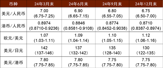 图表1:汇率预测表 (上段为中枢、下段为区间)
