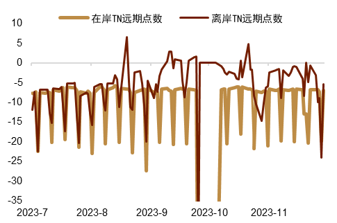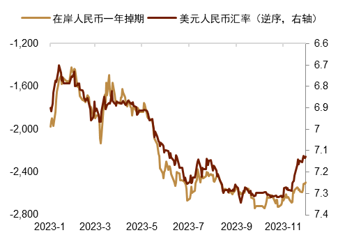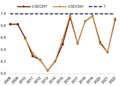 人民币年底仍有升值空间。我们认为有利的内外部环境在12月或将延续,配合出口企业等年末的结汇需求,人民币汇率仍有升值空间。经济数据方面,由于去年11月由于疫情因素扰动,我们认为11月经济数据同比变动将表现较好。其中出口同比有望转正,或将直接转化为支持人民币汇率走强的力量。然而地产链可能依旧表现偏弱,后续是否会进一步颁出政策以稳定地产或值得期待。我们认为12月的关注重点一方面或是美国经济数据,若美国11月就业和通胀数据延续趋冷的态势,那么市场可能会进一步交易美联储更早降息。另一方面则是政策节奏,12月或召开中央经济工作会议,将对2024年的经济工作有所部署。财政将如果发力,房地产风险如何化解或是市场关注重点。我们认为美元指数延续下行态势,政策继续发力或是12月的基准情形。配合出口商在年末的结汇需求,人民币的反身性行情或将在12月继续演绎。且结合往年经验,我们发现在岸、离岸人民币在年末往往收在7.0下方(图表18),这或是美元指数转弱和国内预期转强、汇率季节性等多重因素的综合影响下的结果。总体而言,我们认为内外部因素或将在12月继续共振,人民币仍有走强空间,并有望向7.0的方向进一步反弹。