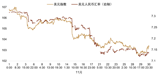 11月月内美元大幅走弱。美元指数在11月月内大幅走低一路向下先后跌破了21天,50天和关键的200天均线,在美国经济数据开始走弱的背景下、美债利率的总体走低、美国与非美国家利差收窄,美元在11月表现最弱,全月来看在G10货币中领跌。