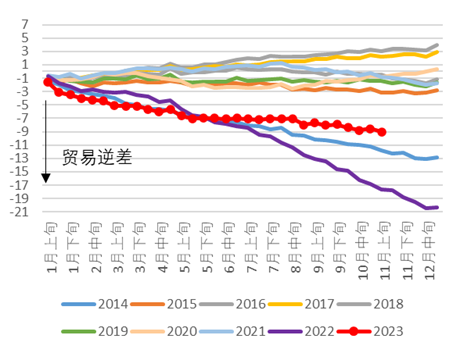 ► 中间价的信号令市场对人民币汇率预期转向升值。11月上旬人民币中间价在7.17-7.18的区间内窄幅波动,20日起开始连续调升,11月30日达到7.1018,回到6月初的水平(图表12)。由于美元指数与美债收益率汇率回落,11月人民币汇率所面临的外部压力缓解。然而中间价连续大幅向强方调整,或给市场释放了人民币进一步升值的信号。配合年末的结汇需求,市场主体或倾向于卖出美元。这推动人民币汇率在20日升值逾700点。中间价在月末则继续维持在7.10-7.12的区间内波动。目前中间价维持在较强水平,不过逆周期因子的调节力度已明显减小,或体现人民币即期汇率的绝对水平已回到较强水平。