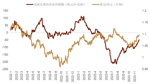 经济数据边际改善 以PMI数据为代表的欧洲经济数据在11月出现边际的改善(图表23),我们认为这或许暗示了下半年经济萎缩的风险有所缓和。总体看,德国PMI的意外好转有助于抵消法国PMI的意外走弱,而这也为欧元的走高提供了支撑。此外,德国11月IFO商业预期指数录得 85.2,虽然不及预期的85.8,但好于前值的84.7。而德国11月ZEW投资者预期指数的改善程度超出市场预期:从10月的-1.1升至9.8,而市场预期仅为5;这也是德国投资者预期指数连续第4个月录得改善,这或许也表明随着通胀的回落,欧洲最大经济体可能正在企稳。在此背景下,欧元区花旗宏观经济意外指数在月内明显走高(图表24)。向前看,我们认为如果欧元区经济可以进一步改善,那么市场或将预期ECB维持利率在当前水平更久,而这可能会对欧元产生一定支撑。此外,德国法院近期否决了财政支出案[22],这可能对德国经济造成利空进而限制欧元的走高幅度。