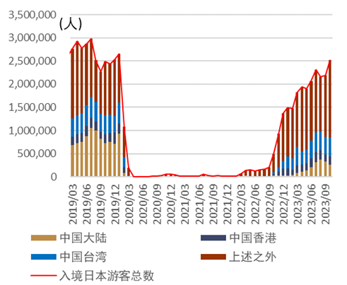 经常账户边际小幅恶化 10月期间日本的经常账户继续呈现了边际上的小幅恶化。贸易账户方面,受能源价格重新走高、日元贬值的影响,贸易收支在近期出现了小幅恶化 (图表35)。服务账户方面,10月的入境日本的游客数量继续回落,已恢复至2019年同期的水平 (图表36)。