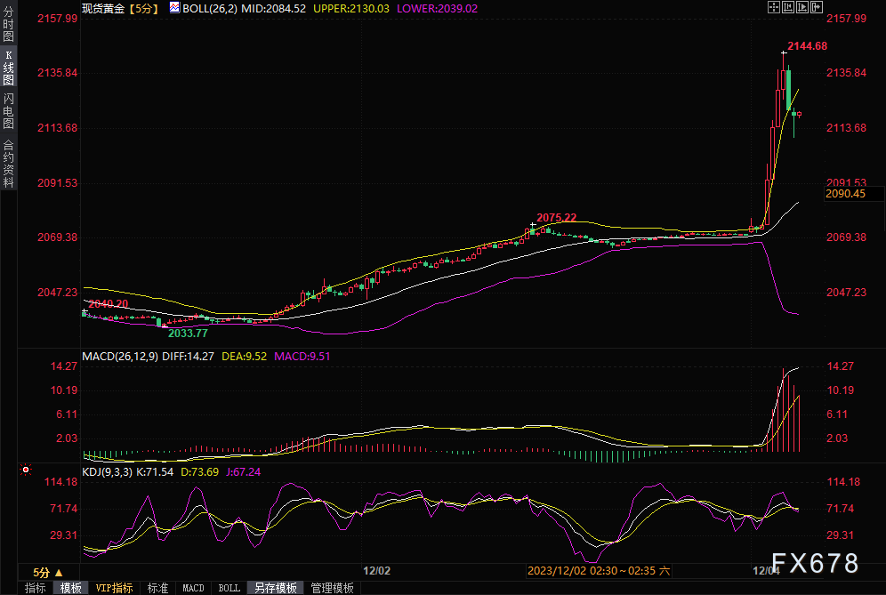 周一(12月4日)亚市早盘,现货黄金继续飙升,短线一度拉升约70美元,刷新历史高点至2144.68美元/盎司,涨幅约3.54%,延续了上周五涨势,上周五金价上涨1.74%,正好涨至历史高点附近。一方面,在临时停火协议破裂后,以色列军队袭击了加沙地带,令市场对中东战火进一步蔓延的担忧情绪急速升温,给金价提供避险支撑。另一方面,上周五美联储主席鲍威尔讲话偏向鸽派,提升了市场对美联储明年上半年的降息预期,也给金价提供上涨动能。